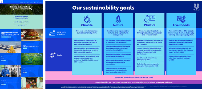 「Climate」「Nature」「Plastics」「Livelihoods」の4テーマを持続可能性に関する優先事項とし、それぞれの中長期の定量的なゴールを設定。ネガティブインパクトの削減と、ポジティブインパクトの増大の方針を定量的に伝えています。サステナビリティサイトでは、この4つのテーマのKPIと取り組みを伝える構成となっています。