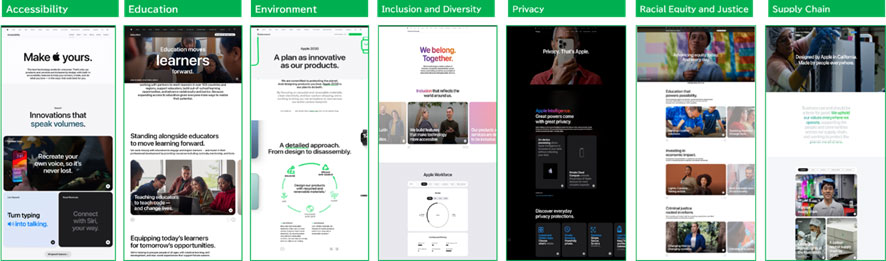 Webサイトでは、「Apple Values」というカテゴリータイトルのもと、「Accessibility」「Education」「Environment」「Inclusion and Diversity」「Privacy」「Racial Equity and Justice」「Supply Chain Innovation」という7つのテーマで構成。このうち、「Accessibility」「Inclusion and Diversity」を除く5テーマについては、PDFで「Impact Report」あるいは「Progress Report」を発行しています。