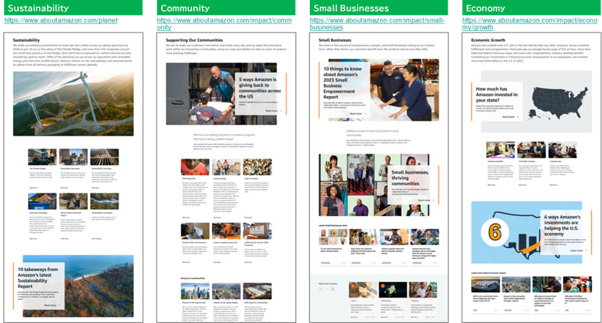 Webサイトでは、「Our Impact」というカテゴリータイトルのもと、「Sustainability」「Community」「Small Businesses」「Economy」の4つのテーマで構成。事業を通じていかにポジティブインパクトを生み出しているかを、定量情報・定性情報を交えてアピールしている。