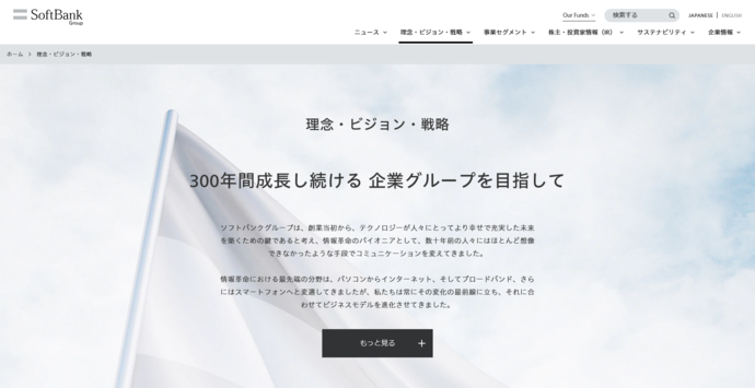 理念や長期ビジョンといった抽象度の高いテーマをどう伝えるかという点では、「ストーリー」のトレンドが重要になります。ソフトバンクグループのサイトでは、理念・ビジョン・戦略がグローバルナビゲーションに配置され、体系的に整理された構造がとられています。「300年成長し続ける企業グループを目指す」というメッセージについても、関連する情報を順にたどることで、考え方と取り組みを段階的に理解できる設計になっています。