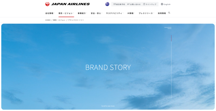 日本航空(JAL)の「ブランド」のページでは、スクロールに合わせて物語が展開していく「スクロールテリング」の手法が用いられています。ページ全体を通して、訪問者は能動的に操作するというよりも、流れに身を委ねながらブランドの世界観に引き込まれていく構成となっています。大きなビジュアルと象徴的なコピーを起点に、JALが大切にしている価値観や考え方が、一つのストーリーとして連続的に提示されます。情報を理解させるというよりも、時間軸に沿って感情や印象を積み重ねることで、ブランドの思想が自然に心に残ります。