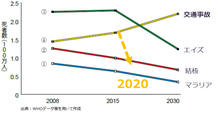 SDGsを通じて理解できる課題は、大きくは、持続可能性の重要性、変革の必要性、取り残される人をなくす等が挙げられるが、更に具体的な課題も発見できる。例えば、ゴール3の「あらゆる年齢のすべての人々の健康的な生活を確保し、福祉を促進する」では、従来から課題とされていた感染症への対応(ターゲット3.3)に加え、その次の段階とも言える前述のUHC(同3.8)や非感染性疾患による若年死亡率の1/3削減(同3.4)、交通事故死傷者数の2020年迄に半減(同3.6)が並列されている。これは、開発途上国においても、衛生状況の改善により感染症が減少し、他方で生活習慣病の増加や自動車の増加による交通事故が大きな問題となりつつある(図3)との認識に基づいている。