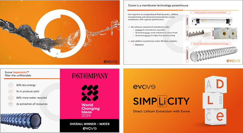 続いて、3Dプリント・セラミック濾過技術のEvove社が、世界GDP の60%に関わる水処理の効率化ソリューションを披露。リチウム抽出を含め、データセンターや半導体など情報化時代の膨大な水需要に応える技術をご覧いただけます。