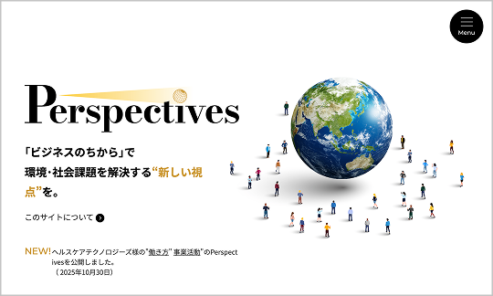 Perspectivesは、社会課題の解決に挑むビジネスパーソンを紹介するWEBメディアです。社会課題解決に挑むビジネスパーソンたちは、どのような視点、展望・見通し(Perspectives)をもって取り組んでいるのか?企業のコミュニケーション支援を担うブレーンセンターが、その過程で出会った活動と、それを支える人たちを紹介しています。